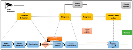 The diagnosis phase involves precisely determining the location of the anomaly within the image and identifying the underlying cause. Then the prognostic phase aims to predict the future state of the system based on historical data and current trends. Finally, the decision-making phase integrates the results of diagnosis and prognosis. It incorporates guidelines and advice from expert systems to guide decision-making, leveraging accumulated knowledge to formulate concrete actions.