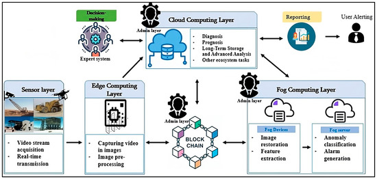 These unique challenges necessitate tailored solutions for open-pit mining environments. The integration of advanced technologies, which has proven effective in underground mining, holds promise for overcoming these constraints in open-pit operations as well. This paper aims to bridge the gap by proposing an innovative, multi-layered architecture specifically designed for surveillance and anomaly detection in open-pit phosphate mines. To address these challenges, we proposed a multi-layered conceptual framework based on the edge–fog–cloud computing paradigm. This approach offers a robust framework that enhances real-time processing, scalability, reliability, security, and adaptability, enabling efficient and effective data processing tailored to a range of essential functions for the comprehensive supervision of the unit, including surveillance, anomaly detection, decision-making, and advanced analytical processes such as prognostics. Additionally, we incorporated blockchain technology to ensure data integrity and security, while also emphasizing the role of human factors by designing the system to collaborate effectively with human operators.