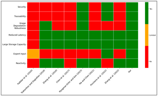 The heatmap, in Figure 3, highlights that our architecture excels in meeting all the key criteria for an intelligent video surveillance system. Specifically, it stands out in critical areas such as security, traceability, image degradation robustness, and responsiveness. While some competing architectures, such as those proposed in [23,29], address security and traceability, the majority fail to adequately cover these aspects. Additionally, many do not sufficiently incorporate expert input or handle image degradation effectively in challenging conditions. In contrast, our solution integrates expert knowledge to enhance decision-making and optimize real-time event management. The multi-layered approach demonstrates efficient data processing at various stages, leveraging the proven capabilities of the selected technologies, as supported by prior studies.