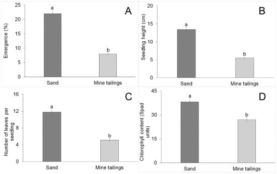Seedling emergence was evaluated daily, and after 60 days, the percentage of emergence (E%) was calculated according to the following equation: E% = (number of emerged seedlings per pot/number of seeds sown per pot) × 100. Seedling survival was evaluated weekly, and survival percentage (S%) was calculated according to the following equation: S% = [number of surviving seedlings/number of emerged seedlings] × 100. The leaves were counted, and the seedling height was measured with a ruler at 7-day intervals. The experiment ended after 60 days, and the chlorophyll content was estimated at three points on the leaf to obtain an average chlorophyll content using a chlorophyll meter model SPAD-502 (Minolta, Tokyo, Japan). Visual symptoms, including the presence of leaf chlorosis (yellowing), necrosis, and possible morphological deformations, were observed and photographed.