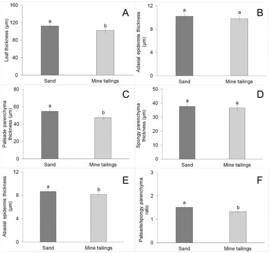 Anatomical characteristics of the interveinal region of Schinus terebinthifolia leaves grown on the following substrates: iron mining tailings and sand. The bars indicate the standard error. For graphs (A,C,E), the means followed by different letters indicate significant differences according to the Scott–Knott test for p < 0.05. For graphs (B,D,F), the means followed by the same letters did not differ significantly according to the Scott–Knott test at p < 0.05.