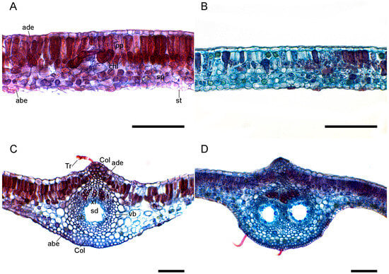 Leaf anatomy of Schinus terebinthifolia grown on the following substrates: sand (A,C) and iron mining tailings (B,D). Images A and B show the interneural region, and images (C,D) show the midrib. ade = adaxial epidermis; pp = palisade parenchyma; sp = spongy parenchyma; abe = abaxial epidermis; chl = chloroplast; st = stomata; xl = xylem; ph = phloem; sd = secretory channel; vb = vascular bundle, Col = collenchyma; Tr = trichome. Bars = 100 µm.