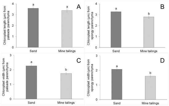 In the plants grown in tailings, the length of the chloroplasts in the palisade parenchyma did not change (Figure 5A). However, the tailings treatment reduced the length of the chloroplasts in the spongy parenchyma (Figure 5B), the width of the chloroplasts in the palisade parenchyma (Figure 5C), and the width of the chloroplasts in the spongy parenchyma (Figure 5D).