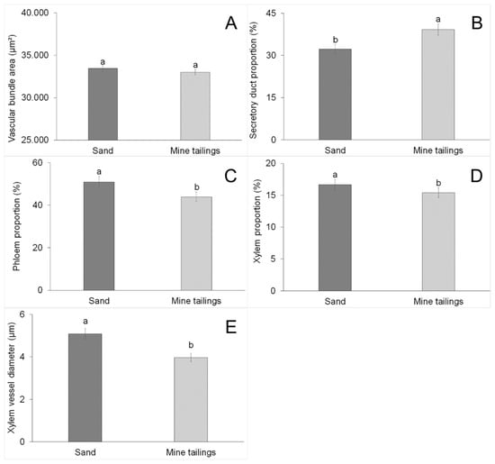 The tailings did not change the area of the vascular bundle in the midrib region (Figure 4C and Figure 6A); however, the proportion of the secretory channel increased (Figure 4C and Figure 6B). Mining tailings reduced the proportion of phloem (Figure 4C and Figure 6C) and xylem (Figure 4C and Figure 6D) in the midrib. The tailings also reduced the diameter of the metaxylem vessel elements (Figure 4C and Figure 6E).