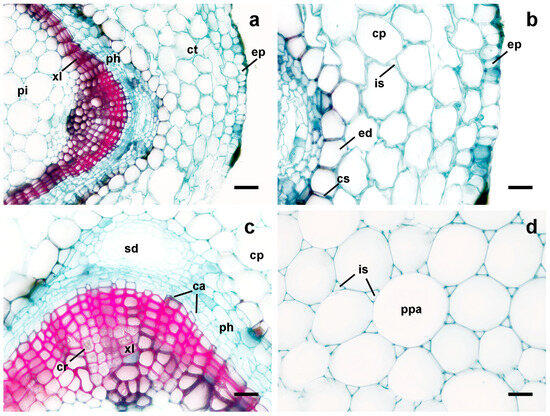 Cross-sections of the primary roots of Schinus terebinthifolia. (a) = overview, (b) = cortex and epidermis, (c) = vascular system, (d) = pith. ep = epidermis, ed = endodermis, cs = Caspary band, ca = cambium, ct = cortex, ph = phloem, xl = xylem, pi = pith, cp = cortical parenchyma, is = intercellular space, sd = secretory channel, cr = crystal, ppa = ground parenchyma. Bars = 50 µm (a); 25 µm (b–d).