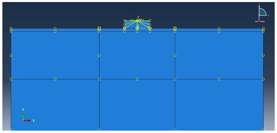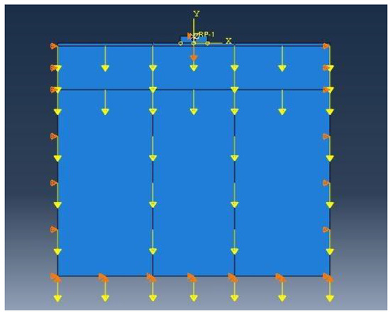 Soil geometry after applying boundary conditions and loading. (yellow arrows show the loading force direction and orange pins show the boundary condition).