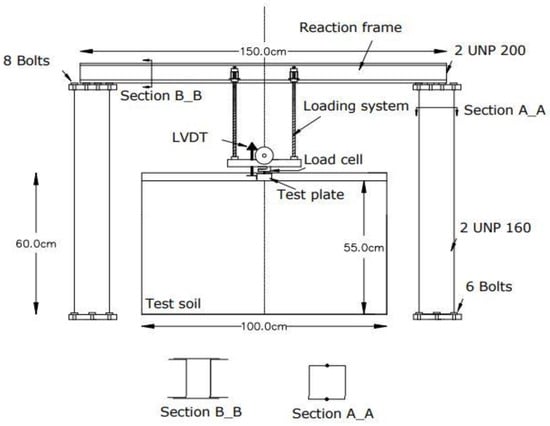 In this section, to ensure the accuracy of the numerical model, the results of the laboratory model [29] were compared with the results of the numerical model. In this model, the loading system, as shown in Figure 6, is implemented almost rigidly, with a strip foundation and two columns, and in the same way, beam and column connections are also installed. We utilized metal plates for the test box to ensure its rigidity. In front of the test box, a Plexiglas plastic plate is placed to observe the changes in the calibration points.