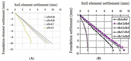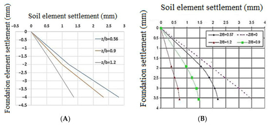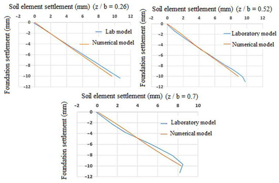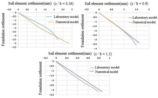 In this section, the results of the experimental and numerical models are shown in the form of a soil element settlement diagram based on the foundation settlement. The results of comparing the experimental and numerical models for two models of loose and dense sandy soil are shown in Figure 8, Figure 9, Figure 10 and Figure 11. The comparison of the results reveals a slight agreement between the two models’ results, indicating that the current research’s numerical model is suitable for use in a parametric study.