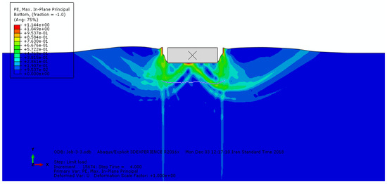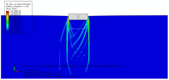 Soil rupture means reaching the ultimate limit of the soil’s bearing capacity, which makes it impossible for the soil to bear more stress and, so to speak, the soil breaks. According to Terzaghi’s theory, the ruptures that occur in soils are of three types: general shear, local shear, and punching shear. We know that soil, like concrete, has a very low tensile strength, which reinforcement methods have strengthened. This research partially compensates this soil deficiency with geotextiles. In the following, some examples of these breaks in the current research models are shown in Figure 12, Figure 13 and Figure 14.