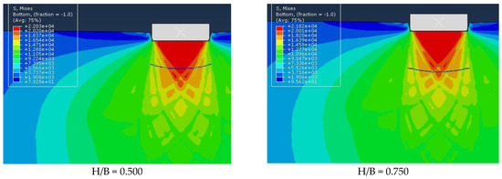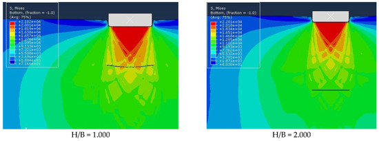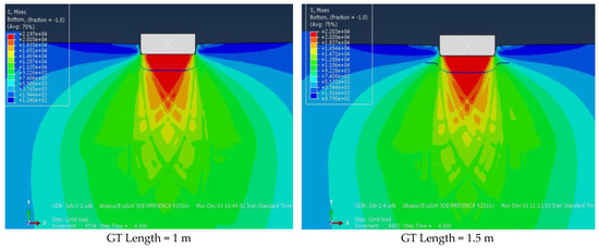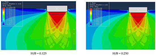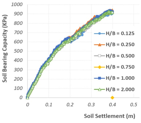In this section, we will categorize research parameters and data to investigate the effect of different variables on the model response. Geotextile burial depth, geotextile length, and soil type are the parameters that have been analyzed and compared with their changes in different models with different conditions. In experiments 1 to 3, the effect of a 1 m long geotextile at a depth of H/B = 0.125 on the bearing capacity of three soil models was investigated. In experiments 4 to 6, the effect of a geotextile 1.5 m long at a depth of H/B = 0.125 on the bearing capacity of three soil models was investigated. From test number 7 to the last test, the depth of geotextile installation was increased, as shown in Table A1.