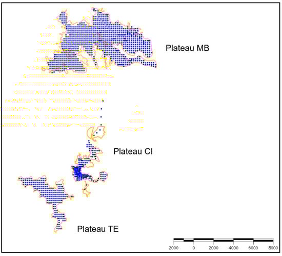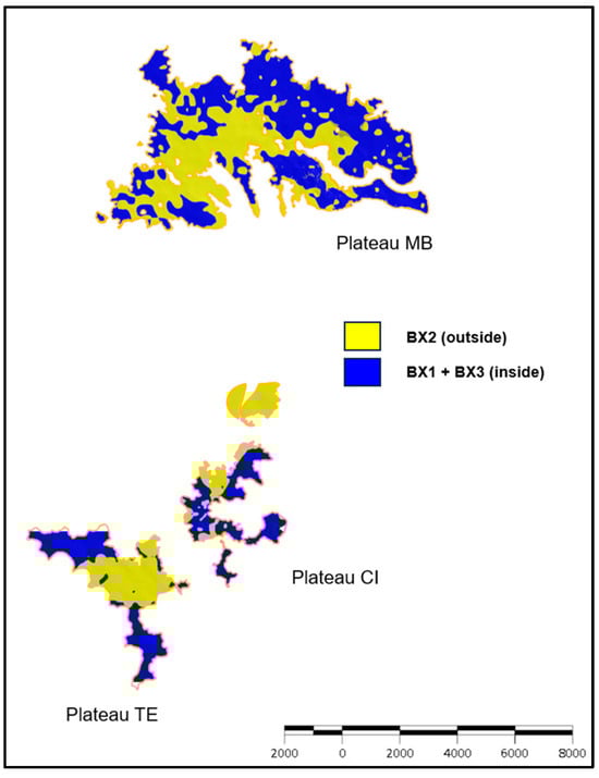 Figure 1 presents an initial granulometric/geochemical classification to guide exploratory data analysis. The classification considers the contents of alumina, silica, and iron oxide. Petrological characteristics, such as texture, are also considered to define the solid colors for BXD1, BXD2, and BXD3. The region dominated by alumina-rich minerals is represented by the red color, BXD1. The region with a higher concentration of silica is defined by the orange color, BXD2. Lastly, the region characterized by ferruginous minerals is represented by the green color, BXD3. Figure 2 illustrates the 2D positions of each sample used in this study. The drilling holes had a depth of 20 m, and the grid spacing was 200 m × 200 m for the TE and MB plateaus. For the CI plateau, the grid spacing was reduced to 100 m × 100 m in the central region.