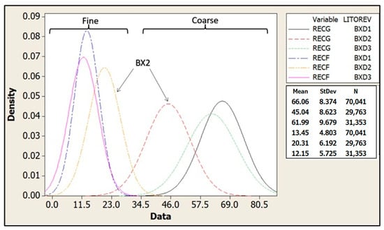 Similarly, deviations are observed in the fine fraction, suggesting that the BXD1 and BXD3 populations exhibit similar behavior during sieving. This indicates that higher mass recovery in the coarse fraction can be expected when the plant is fed with material from BXD1 and BXD3.