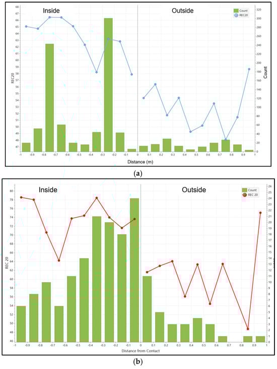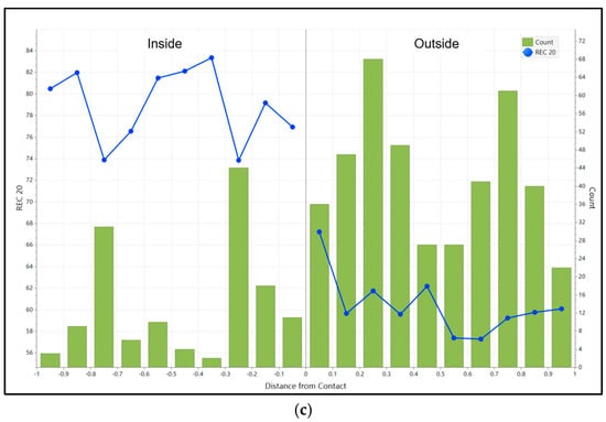 To validate the results obtained during implicit modeling and test the contacts of the geometallurgical domains, contact analysis was applied to all domains. This method considers the number of samples contained in each solid, the distance to the contact surface, and the variation in content depending on the distance. The results of this analysis can classify contacts as abrupt or soft. Figure 6a presents a contact analysis for the TE plateau. Figure 6b shows a contact analysis for the CI plateau. Figure 6c presents a contact analysis for the MB plateau. All analyses included an analysis of the RECG variable. The results of the graphical analyses indicated hard contact where the recovery variation was abrupt at the boundary between the domains analyzed. This behavior indicated that the geometallurgical model was valid and capable of satisfactorily segregating the populations.
