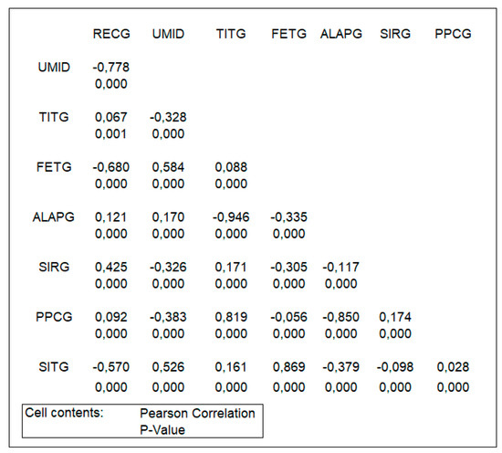 The variable selection process began with the application of the correlation matrix, where all physical and chemical variables present in the database and their correlations for each domain, fraction, and plateau were evaluated. Figure 7 presents the correlation matrix of the TE plateau, GMD1, in the coarse fraction. The matrix measured the relationship between the database variables and RECG. The variables with the highest correlation were selected to be analyzed by stepwise regression.