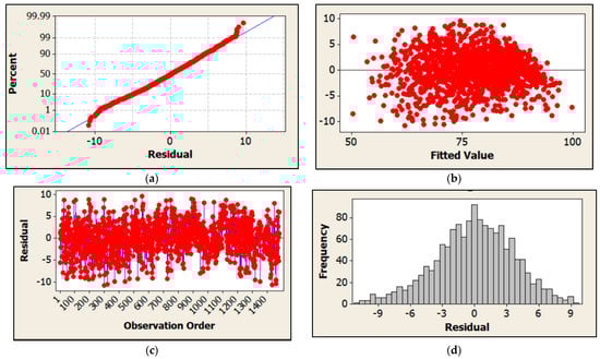 For additional validation of the model, a graphical residual analysis was performed. For this routine, it was necessary to ensure that the residuals followed a normal distribution, had constant variance, and were independent, as assumed in a multiple linear regression model. In Figure 8a, the normal probability plot shows that the points follow the theoretical normal probability line, with p-values >0.15; therefore, it can be assumed that the residuals do not deviate significantly from a normal distribution. Figure 8b shows the plot of residuals versus the fitted values, where the assumption of constant variance is not violated. The residuals are randomly distributed around zero and have approximately the same dispersion for all fitted values. No outliers are present. Figure 8c presents the graph of residuals versus the order of observation; the points do not show a trend and, therefore, it is assumed that the errors are independent. In Figure 8d, the histogram presents information compatible with a normal distribution. Thus, all elements necessary to validate the model were satisfactorily fulfilled. Therefore, Equation (1) can adequately explain the mass recovery in the coarse fraction (TE plateau/GMD1).