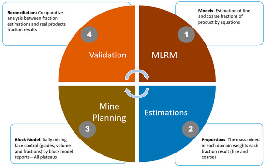 The results obtained after applying the geometallurgical model estimated via multivariate linear regression confirm the validity and the ability to generate mineral processing performance predictions. Despite requiring a long period of data analysis, the application of the geometallurgical model does not require an adaptation period in the mineral processing unit or mining operations. Over the four weeks of testing, mining operations alternated between plateaus, with only two of the three plateaus participating in the feed at a time. This alternation is a common characteristic of the mining process and highlights the importance of testing over several weeks to avoid bias from this practice. Despite this, the results showed only a 2.4% deviation between the estimated and actual mass recovery for the coarse fraction. Based on previous studies, this value can be considered a low deviation for geometallurgical models [11]. This outcome concludes the validation and reconciliation phase of the model, demonstrating its capability to make reliable predictions. While only the coarse fraction was modeled due to operational constraints, the studied mine plans to gradually incorporate fine fraction data using predictive methods and estimation tools.