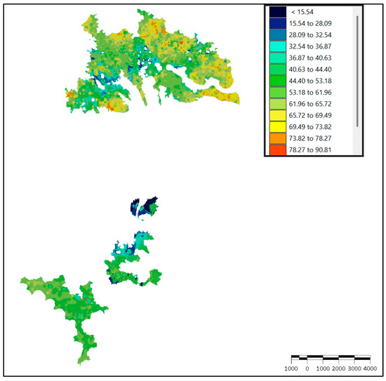 Figure 10 presents the results of the estimates for the MB, TE, and CI plateaus by 2D contouring, where the cold colors indicate the lowest mass recoveries for the coarse fraction and the warm colors indicate the highest values. The blending of these three mining areas constitutes the feed for the mineral processing unit.
