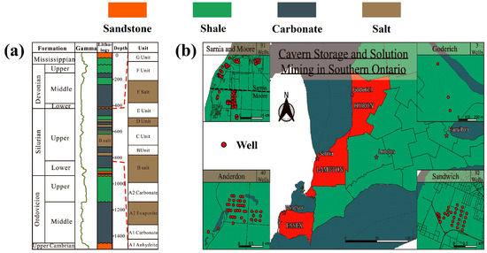 Locations of all wells and lithostratigraphy of Southern Ontario (modified from [25,26]): (a) stratigraphic and lithological column of Southern Ontario and (b) distribution map of cavern storage in Southern Ontario.