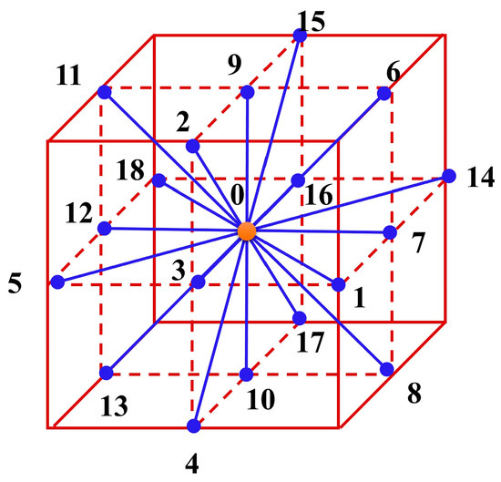 - Directional growth mechanism: After the solid phase is randomly arranged with the initial distribution probability pc, the directional growth mechanism is introduced instead of the fixed growth probability pd. Under this mechanism, the solid phase unit expands and grows in 6 principal axis directions and 13 diagonal directions (Figure 2), and there are different growth probabilities pimq in different directions. This growth model simulates the directional characteristics of rock pores. For example, the probability of pore expansion along some preferred directions (such as the crystal axis) is greater, and vice versa. This mechanism is more in line with the spatial distribution of rock pores in nature.