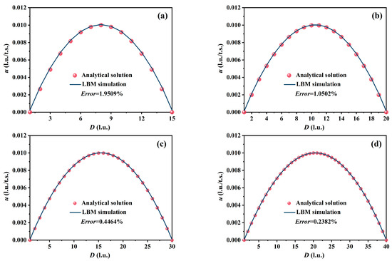 Comparison of Poiseuille flow analytical solution with LBM simulations: (a) B = 15 l.u., (b) B = 20 l.u., (c) B = 30 l.u., and (d) B = 40 l.u.