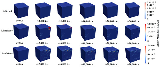 To investigate the hydrogen transport characteristics in different energy storage rock samples, this section simulates and analyzes the permeation process of three typical digital rock models—salt rock, limestone, and sandstone—under the same pressure gradient condition (Δp = 0.0008 m.u./l.u.·t.s.2) using the LBM. The focus is on the spatiotemporal distribution characteristics of the velocity field during the permeation process, as well as the evolution trends of the average and maximum transport velocities over time.