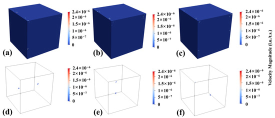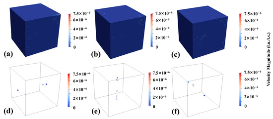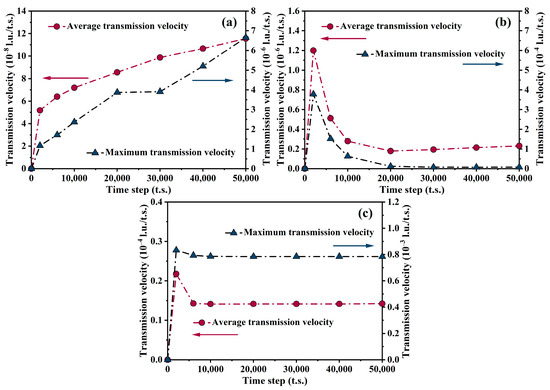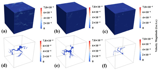 Figure 6 presents the variation trends of the average and maximum transport velocities over time in the three energy storage rock samples. From Figure 6, it can be observed that in salt rock (Figure 6a), the average transport velocity rapidly increases during the initial phase (t = 0−10,000 t.s.) and then gradually stabilizes. This is primarily due to the limited diffusion of hydrogen in the low porosity core, which suppresses the growth of transport velocity. The trend of the maximum transport velocity is similar to that of the average velocity, but with overall lower values, indicating significant resistance to hydrogen transport in salt rock. The dense pore structure of salt rock means hydrogen primarily penetrates through a small number of pore channels, resulting in low flow rates and a slow transport process. For limestone (Figure 6b), both the average and maximum transport velocities show rapid decay in the initial stage (t = 0−10,000 t.s.), followed by gradual stabilization. This reflects rapid hydrogen permeation through the fracture channels, with the diffusion gradually becoming more uniform over time. The maximum transport velocity is relatively high in the initial stage, indicating that the flow rate in the fracture region is much higher than in the matrix region. The microfracture structure of limestone leads to high transport rates in the fractures, while the matrix portion causes significant resistance to flow, resulting in an uneven velocity field distribution. For sandstone (Figure 6c), the average transport velocity rapidly increases at the initial time step and then stabilizes, while the maximum transport velocity remains high and relatively constant. The average transport velocity is approximately 0.25 × 10−3 l.u./t.s., and the maximum transport velocity is about 0.8 × 10−3 l.u./t.s. This is due to the high porosity and excellent connectivity of sandstone, allowing hydrogen to quickly diffuse through the pore network, resulting in superior overall transport performance with a nearly uniform velocity distribution.