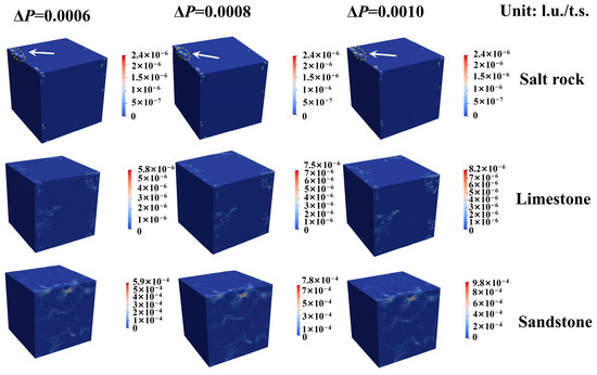 Figure 7 shows the distribution of the transmission velocity field in the three types of energy storage rock cores under different pressure gradients. From Figure 7, it can be observed that for salt rock (salt rock) at the lower pressure gradient (Δp = 0.0006 m.u./l.u.⋅t.s.2), the transmission velocity field is primarily concentrated at the core entrance, and the diffusion range is very limited. As the pressure gradient increases (Δp = 0.0008–0.0010 m.u./l.u.⋅t.s.2), the transmission velocity field gradually extends deeper, but the overall velocity values remain low. This is due to the dense internal structure of salt rock, with very few pore channels and significant transport resistance. Even with an increased pressure gradient, the increase in velocity is limited, and salt rock demonstrates good airtightness. For limestone, under all pressure gradient conditions, the velocity field primarily extends along the fracture channels, and as the pressure gradient increases, the transmission velocity increases significantly. Unlike salt rock, the fractures within limestone provide effective pathways for permeation. Due to the heterogeneity of limestone, hydrogen mainly travels through fractures, and the increase in pressure gradient further drives the flow rate within the fractures. However, the overall distribution still exhibits heterogeneity. For sandstone, at the lower pressure gradient (Δp = 0.0006 m.u./l.u.⋅t.s.2), the velocity field is already evenly distributed throughout the core. As the pressure gradient increases, the transmission velocity further increases, and the distribution range almost covers the entire core. This can be attributed to sandstone’s high porosity and excellent connectivity, allowing hydrogen to uniformly diffuse through the pore network and exhibiting a linear response characteristic as the pressure gradient increases.