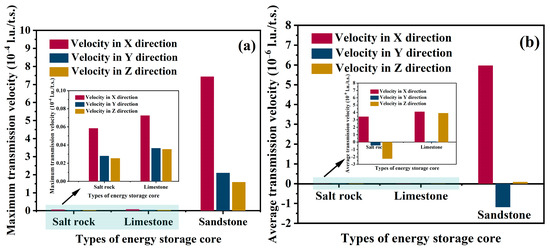 Combining the quantitative results presented in Figure 12, the transmission characteristics of the three rock cores differ significantly. In terms of maximum transmission velocity, sandstone shows the highest velocity in the X direction (9.7 × 10⁻⁴ l.u./t.s.), which is significantly higher than that of limestone and salt rock. This is mainly due to sandstone’s larger porosity and the presence of preferential flow paths. Limestone follows, with a maximum velocity of 5.5 × 10⁻⁴ l.u./t.s., as its pore space connectivity is good, providing relatively uniform transmission pathways. Salt rock has the lowest maximum transmission velocity, at only 6.2 × 10⁻⁴ l.u./t.s., due to its dense structure, which limits fluid transmission. Regarding average transmission velocity (Figure 11b), the average velocity in the X direction for sandstone is also much higher than for the other rock cores, and it exhibits significant non-uniformity in the Y and Z directions. Limestone shows little variation in average velocity across the three directions, reflecting the uniformity of its structure, while salt rock’s average velocity is nearly zero, further confirming the inhibitory effect of its dense structure on fluid transmission. In summary, salt rock’s dense structure results in minimal effective flow channels in its pore space, leading to very low transmission velocities. Limestone, due to its uniform pore connectivity, shows relatively uniform transmission velocities. Sandstone, with a high porosity and heterogeneous structure, shows high transmission velocities in preferential local flow paths. The transmission velocity differences in different directions for salt rock and sandstone reflect the impact of anisotropic structures on fluid transmission, with sandstone exhibiting more pronounced directional preferential pathways. The existence of local high-velocity regions in sandstone is primarily associated with pore connectivity and the distribution of crystal fractures, which form preferential paths and concentrate fluid transmission in specific directions.