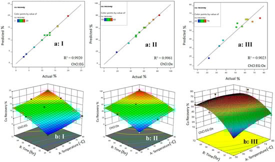 Furthermore, Equation (2) was used to calculate the predicted values compared to the actual values from the experiments, as shown in Figure 1(aI,aII,aIII). The results indicate a strong agreement between the expected and actual values. Three-dimensional response plots, as shown in Figure 1(bI,bII,bIII), were also used to explore the correlation between the working temperature, contact time, and copper recovery efficiency. Increasing the contact time between the DES (C3) and the chalcopyrite concentrate improved the copper extraction. Additionally, changes in the working temperature directly affected the efficiency of the copper recovery.