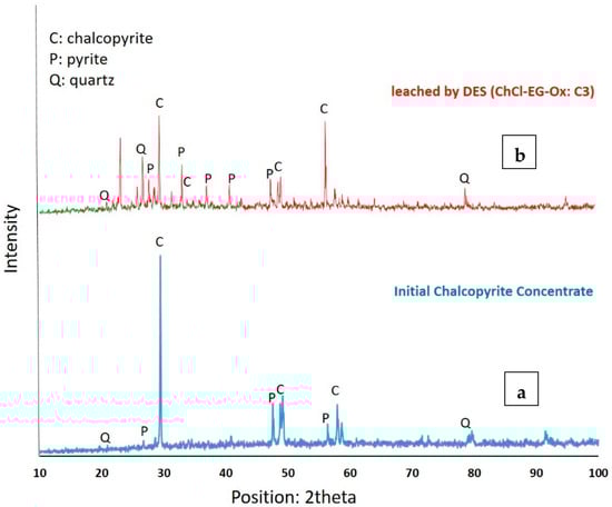 The X-ray diffraction graph of (a) the initial chalcopyrite concentrate and (b) its leaching by the deep eutectic solvent of C3 for 48 h.
