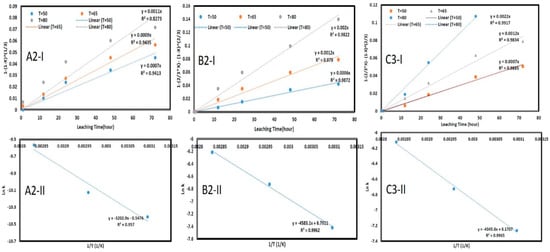 To investigate the dissolution rate of copper from chalcopyrite concentrate using deep eutectic solvents at varying temperatures, a series of experiments were carried out at 50, 65, and 80 °C with a pulp density of 1:6 S/L. The results of the kinetic study using the synthesized solvents (A2, B2, and C3) are presented in Figure 3. Figure 3(A2-I,B2-I,C2-I), corresponding to Equation (5), shows good alignment with the model and an acceptable R2 value, suggesting a diffusion-controlled reaction. To confirm this, the activation energy was calculated using Equation (6): kD = A exp(−Ea/RT). In Figure 3(A2-II,B2-II,C2-II), plotting the natural logarithm of the rate constant (Ln k) against the reciprocal of temperature (1/T) enabled the calculation of the activation energy (−Ea/R). The activation energies determined for substances A2, B2, and C3 were 26.6 KJ/mol, 37.4 KJ/mol, and 35.75 KJ/mol, respectively. The relatively low activation energy suggests that the reaction is governed by a diffusion-controlled model through the ash layer [56], as diffusion-controlled reactions typically have lower activation energies and higher rates than chemically controlled reactions [57].