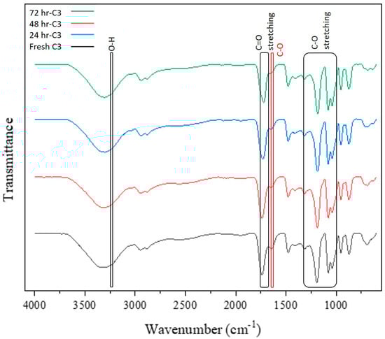 The impact of heat treatment on the structure of deep eutectic solvents was studied by subjecting them to a constant temperature of 75 °C for 24, 48, and 72 h, and comparing them to untreated solvents (Figure 5). Esterification involves the reaction of an acid and an alcohol to produce an ester and water [62].