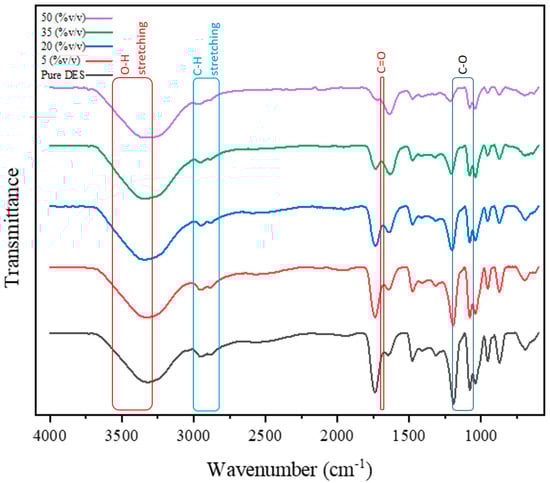 In Figure 6, where the pure deep eutectic solvent is used, the infrared spectrum includes peaks of O-H stretching vibration in the range of 3600 to 3200 cm−1, C=O stretching vibration at approximately 1700 cm−1, C-H stretching vibration in the range of 3000 to 2800 cm−1, and C-O stretching vibration in the range of 1300 to 1100 cm−1 [67]. In the esterification reaction, where an alcohol and an acid react together, the bands corresponding to the hydroxyl O-H and carbonyl C=O should decrease in intensity, and, in turn, a band corresponding to the ester C=O should be formed. Initially, by comparing the band related to the carbonyl C=O bond at around 1700 cm−1 under different water content conditions in the solvent, this band is observed to have the least change [68].