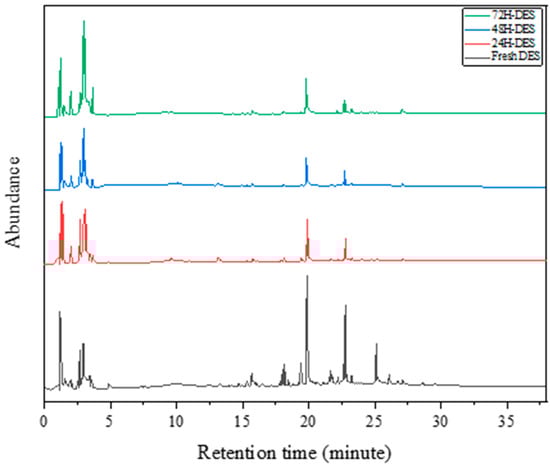 As seen in Figure 7, to better understand the esterification reaction and analyze the compositional changes resulting from this phenomenon in deep eutectic solvents (C3), gas chromatography/mass spectrometry analysis was performed on fresh solvents and solvents that had been heated at 75 °C for 24, 48, and 72 h. As the deep eutectic solvent is a combination of three different substances, the obtained chromatograms show multiple peaks corresponding to different compounds.