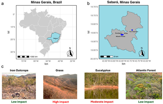 Geographical location of the study area and representative images of ecosystem vegetation. (a) Geographical location of the state of Minas Gerais in Brazil. (b) Geographical location of four ecosystems sampled in Sabara, Minas Gerais: iron outcrops (19°50′2.06″ S, 43°47′7.40″ W), grass (19°51′38.59″ S, 43°47′47.36″ W), eucalyptus (19°51′37.85″ S, 43°48′23.75″ W), and Atlantic forest (19°51′41.41″ S, 43°48′7.90″ W). (c) Representative images of the ecosystem sampled in this study, showing a typical vegetation landscape.