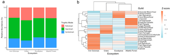 Fungal trophic modes and functional guild profiles of soil fungal communities (based on the FUNGuild database) from four ecosystems with varying mining impact levels. (a) Relative abundance of the trophic modes across ecosystems. (b) Heatmap of functional guild profiles across ecosystems, with the clustering analysis based on Euclidean distances. The color gradient from red to blue represents higher to lower abundances relative to the group (row) based on Z-score normalization. Grass (high impact, n = 2), Atlantic forest (low impact, n = 2), eucalyptus (moderate impact, n = 2), iron outcrops (low impact, n = 2).