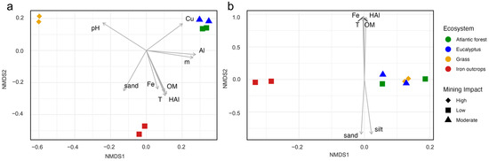 Nonmetric multidimensional scaling (NMDS) plot tracking the correlation between community similarity and soil variables across different ecosystems under varying mining impacts. (a) Distribution of ecosystems based on fungal taxonomic composition and influenced by significant soil variables (p < 0.05). (b) Distribution of ecosystems based on fungal functional guild profiles influenced by significant soil variables (p < 0.05). NMDS stress is near zero for both analyses (stress < 0.2). Cu: copper; Al: aluminum; m: saturation index of aluminum; OM: organic matter; HAl: total acidity; T: cation exchange capacity; Fe: iron; soil texture (sand, silt).