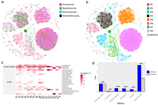 Ascomycota is the phylum with the highest relative abundance (78.1% of nodes), followed by Basidiomycota (13.9%), Mucoromycota (2.9%), and Mortierellomycota (0.7%) (Figure 4a). A total of 16 distinct modules were identified in the network, with a higher interconnection of nodes in modules 1 to 8 (Figure 4b). A higher diversity of functional guilds was detected in modules M1, M2, M5, and M6, whereas modules M11 to M16 were dominated by no more than two functional guilds (Figure 4c). The observed co-occurrence network showed significantly higher (p < 0.001) topology metrics compared with the simulated random networks (Figure 4d). These results suggest a non-random and more clustered network topology, indicating that the observed network structure is more complex and cohesive than what would be expected in a random network.