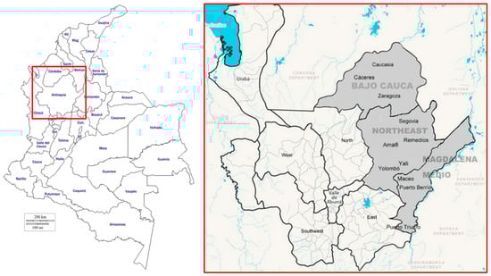 Location of the Northeast Antioquia area (adapted from [1], area in red zoomed).