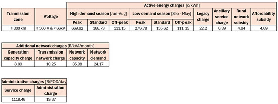 - Eskom. Schedule of Standard Prices for Eskom Tariffs 2025/26; Eskom Holdings SOC Ltd.: Sandton, South Africa, 2025. [Google Scholar]