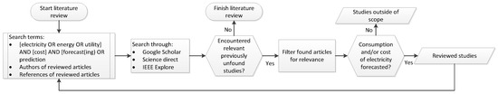 This review considered studies related to the forecasting of electricity usage and the forecasting of electricity cost. Studies on the impact of renewables on these parameters were excluded as it is not relevant to the study topic.