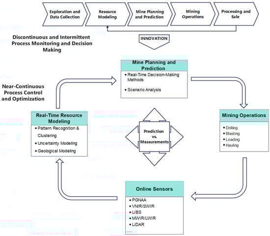 To address these challenges, the concept of real-time mining (RTM) emerged about a decade ago [16]. RTM aims to optimize resource extraction and minimize environmental impacts through continuous monitoring and immediate data analysis. By employing real-time data from advanced sensors and analytics, RTM enhances process efficiency, maximizes mineral recovery, and facilitates immediate adjustments based on the latest information [17,18]. The core idea is to create a closed-loop management system where operational data feeds back into decision-making processes in real time, enabling dynamic optimization of extraction, processing, and overall efficiency. In general, key constituents of the RTM approach are advanced real-time sensors, optimization algorithms, and data assimilation. Continuous grade control becomes possible, allowing for accurate ore characterization and immediate responses to changes in ore quality [6].