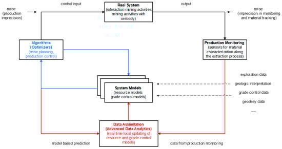The “real system” in this context embodies the physical mining environment, which includes activities such as drilling, blasting, hauling, and processing that interact directly with the orebody. The effectiveness of these activities is influenced by control variables, such as equipment schedules and mine plans. The system is also influenced by inherent variability and uncertainty, which is depicted as “noise” in the figure.