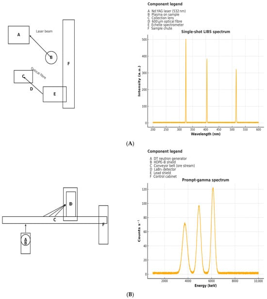 Schematic layouts and illustrative (synthetic) outputs of the two sensing technologies investigated. (A) Laser-induced breakdown spectroscopy (LIBS), (B) prompt gamma neutron activation analysis (PGNAA).