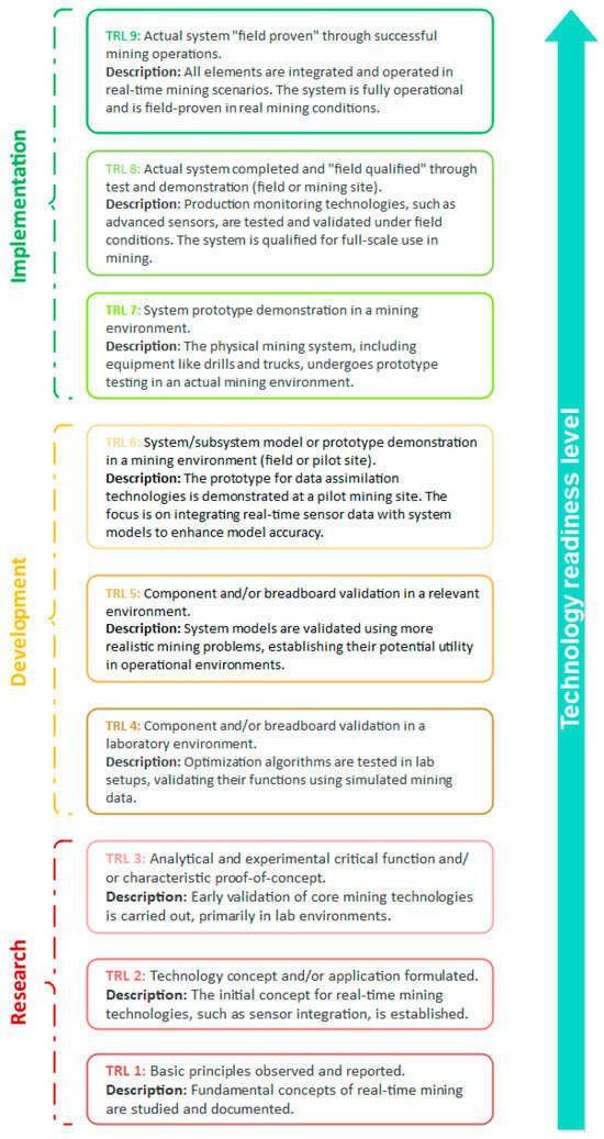 Despite its potential, the full RTM concept remains largely theoretical, with limited practical implementation due to technological and operational barriers. Factors such as inadequate sensor designs for field applications, high initial costs, and the need to demonstrate practical utility have hindered widespread adoption. Integrating advanced sensors into the harsh and variable conditions of mining environments poses significant technical challenges that demand robust and durable designs [21]. The technology readiness level (TRL) framework, which ranges from basic principles (TRL 1) to fully operational systems (TRL 9), highlights the substantial gap between research and application. To date, no operational mine has fully integrated RTM approaches, underscoring the low TRL status of these technologies. This status emphasizes the considerable development and testing required to advance key constituents of the RTM approach toward practical deployment.