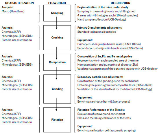 This section outlines the methodologies, procedures, and tests used to achieve the objectives of this study. Figure 1 illustrates the geometallurgical characterization flowchart associated with this research.