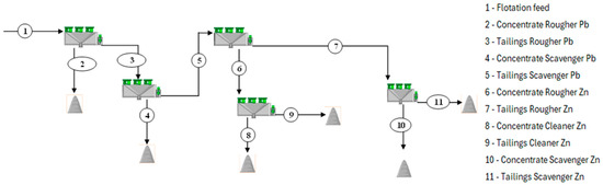 The flotation circuit consists of two sequential flotation stages (the reagents used are listed in Table 2). The first stage focuses on the flotation of galena (lead ore mineral), followed by the flotation of sphalerite (zinc ore mineral):