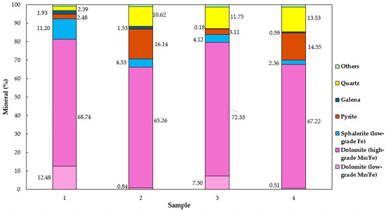 - “The A mineralized body, represented in the sample from mining front 1, had the lowest percentage of quartz in its modal mineralogy (2.39%), which directly correlates to a shorter grinding time required to achieve the target P80 of 45 µm (10 min). It was evident from the MLA image analysis combined with the modal mineralogy and the quantification of surface exposure of the particles that this is the mineralized body least affected by pyrite, as a global Pb recovery of 91.1% was achieved in the bench-scale flotation, as well as a scavenger concentrate with 5.44% Pb. This ore body also showed the highest percentage of sphalerite mineral; however, it had the third-highest global Zn recovery (92.3%), as well as a scavenger concentrate with 5.87% Zn. This result is attributed to the mineralogical association of sphalerite with the dolomitic matrix, which leads to the loss of the target sulfide in the final tailings, as shown in the MLA analysis (Figure 7 and Figure 8).