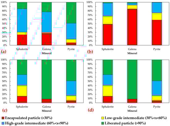 Based on these classifications, Figure 4 quantifies the composites according to the subgroups of particle surface exposure. The data presented shows that sulfide minerals are predominantly in liberated form, with the exception of mining front 2, which has a large number of encapsulated particles—49% of sphalerite, 84% of galena, and 58% of pyrite. This suggests that the surfaces of these particles are partially or fully exposed to the sizes that feed the flotation process.