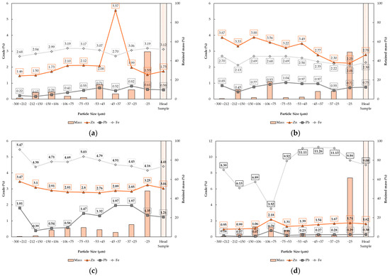 Size and chemical distribution of the grinding product—composite sample from mining fronts 1 (a), 2 (b), 3 (c), and 4 (d).